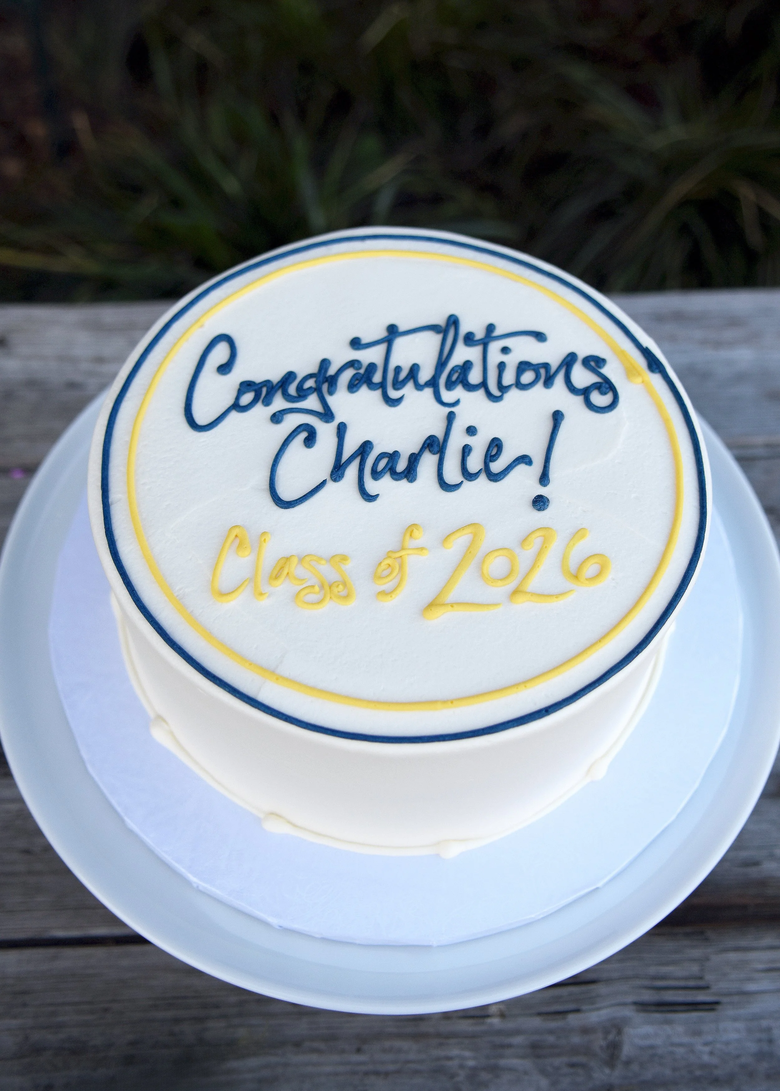 Feel free to order a classic 9” round cake through our Online Ordering. Simply comment in the special notes section what you would like for the writing to be and which color would best fit your needs.